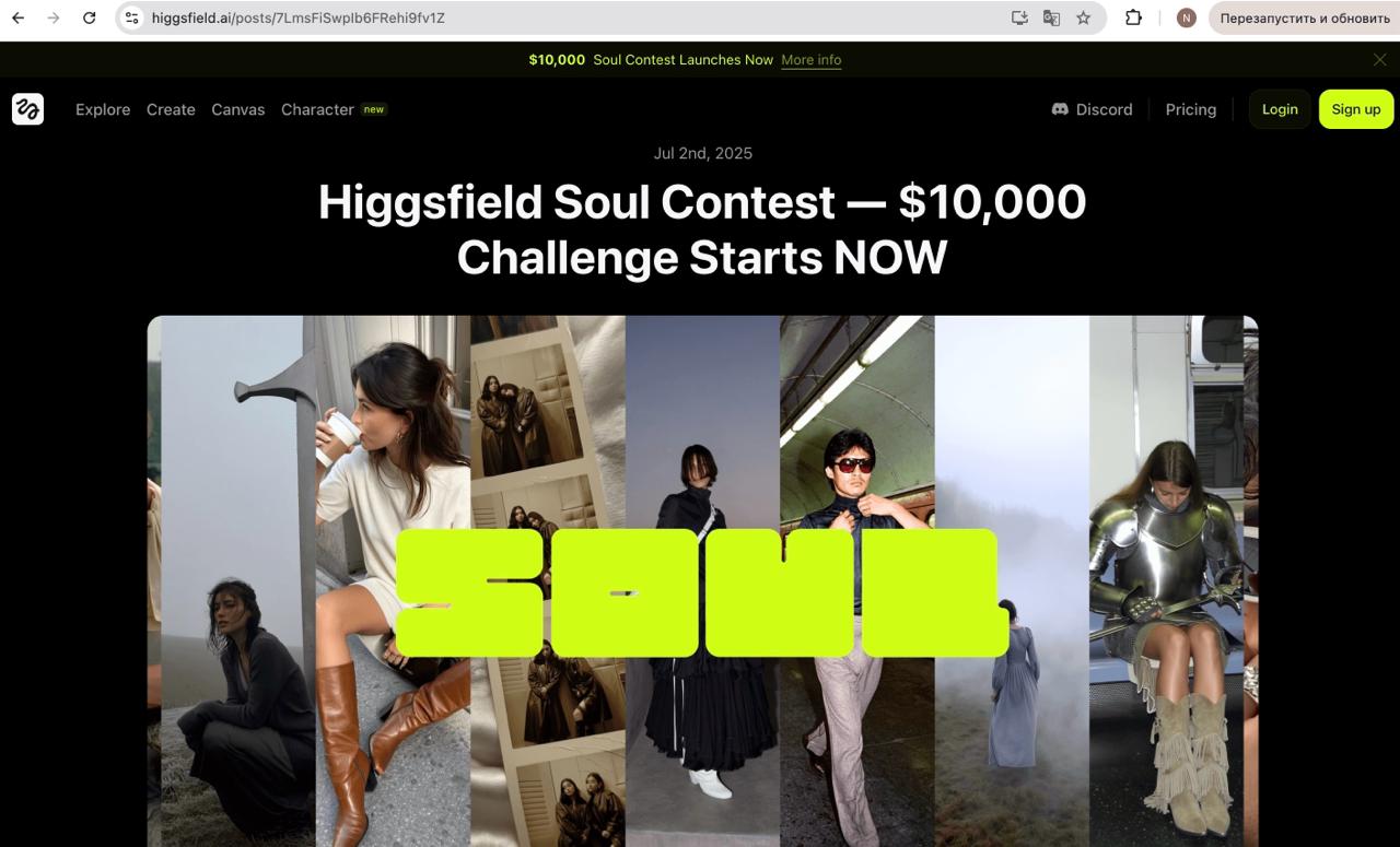 🖊 Free-триал: с июля 2025 г. Soul можно тестировать без оплаты ― каждый новый аккаунт получает суточный лимит бесплатных генераций (Higgsfield в соцсетях называет это «Free for everyone to try»)
